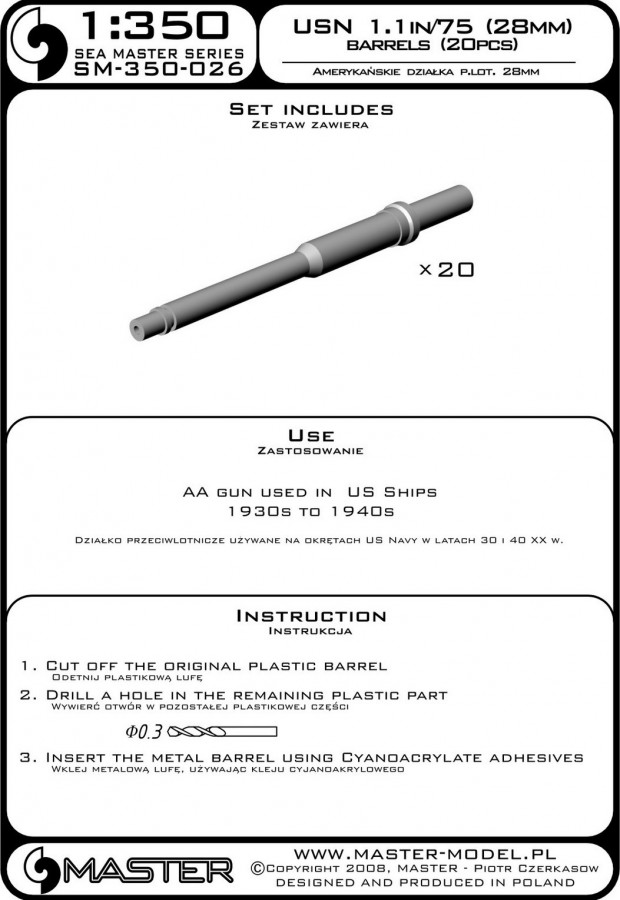 The set includes turned brass barrels. It is very simple to use in Your model, and makes it extremely realistic. Simply cut off the original plastic barrel and drill a hole in the remaining part and insert the metal barrel using Cyanoacrylate adhesives.