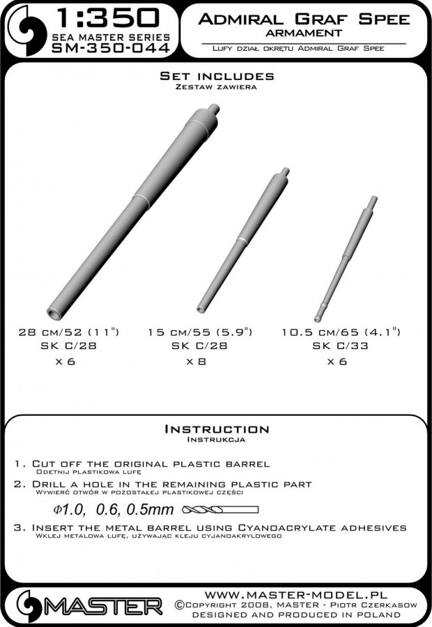 The set includes turned brass barrels. It is very simple to use in Your model, and makes it extremely realistic. Simply cut off the original plastic barrel and drill a hole in the remaining part and insert the metal barrel using Cyanoacrylate adhesives.