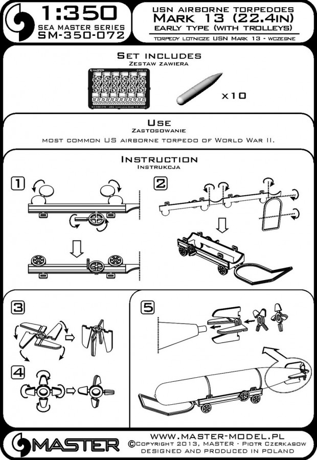 The set includes turned brass Mark 13 (22.4in) torpedoes and photoetched fret with trolleys parts.