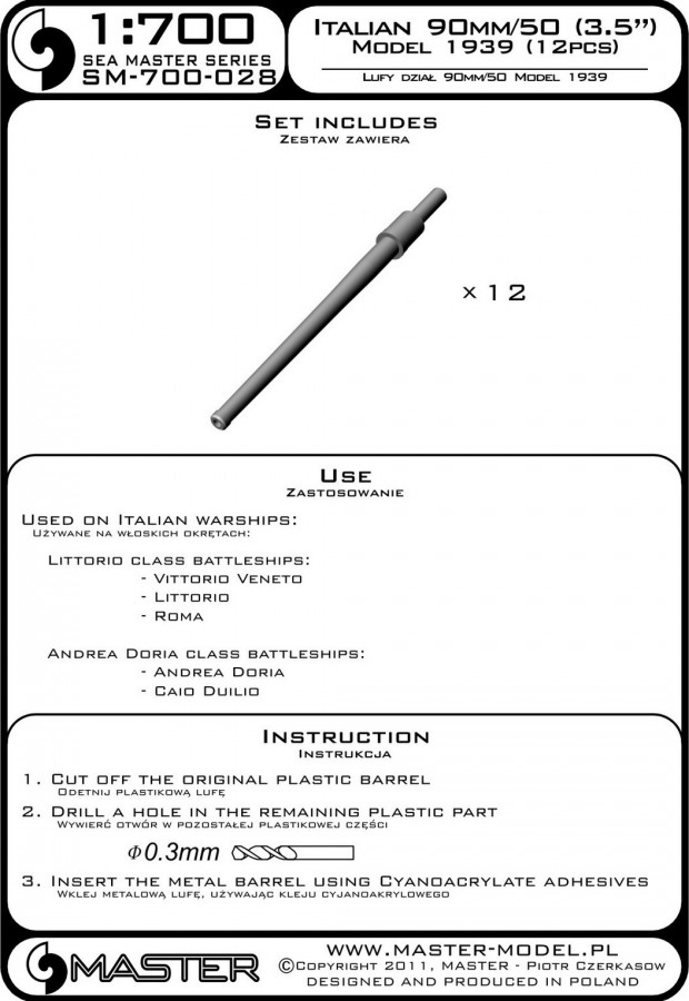 The set includes turned brass barrels. It is very simple to use in Your model, and makes it extremely realistic. Simply cut off the original plastic barrel and drill a hole in the remaining part and insert the metal barrel using Cyanoacrylate adhesives.