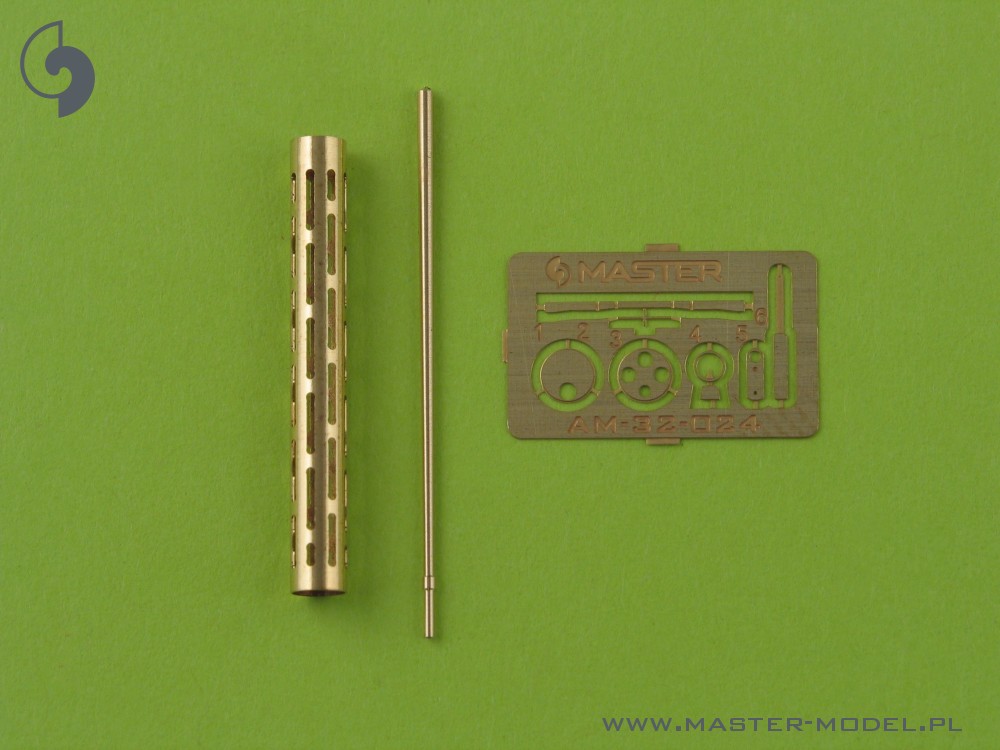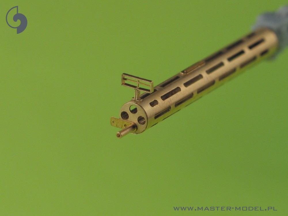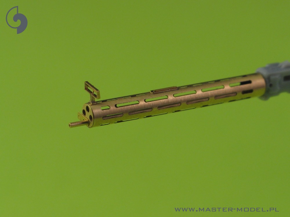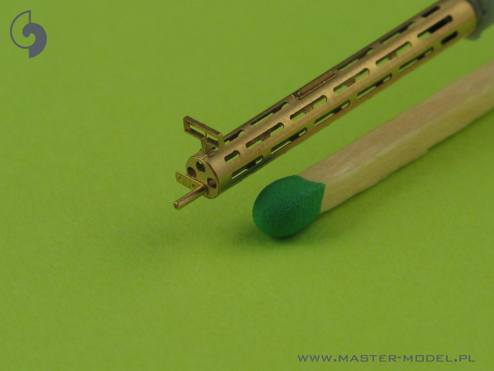The set includes one turned brass barrels with drilled cooling jacket. It is very simple to use in your model, and makes it extremely realistic. Simply cut off the original plastic barrel and drill a hole in the remaining plastic parts and insert the metal barrel using Cyanoacrylate adhesives. We advise soldering to join metal parts together.