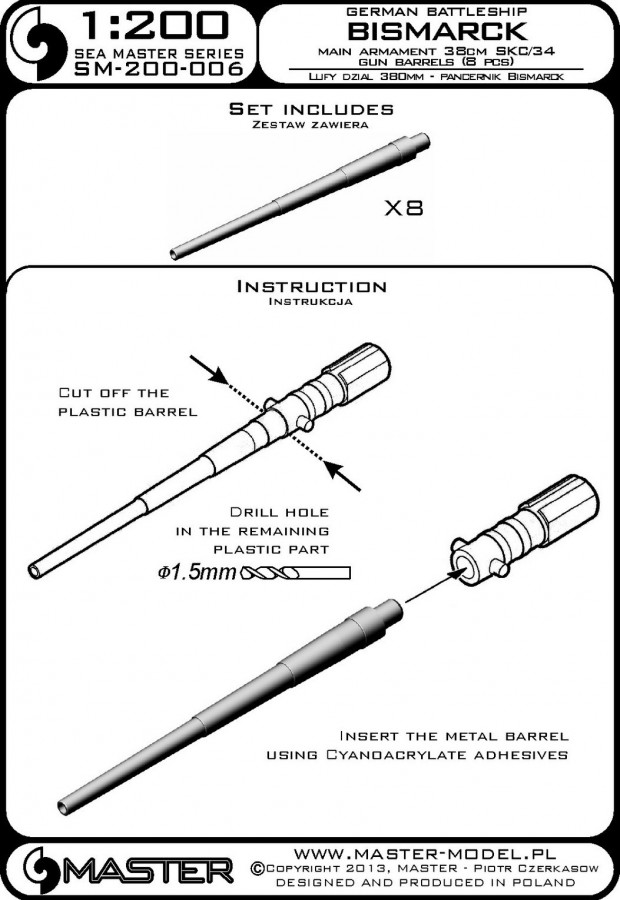 The set includes turned aluminum barrels. It is very simple to use in Your model, and makes it extremely realistic. Simply cut off the original plastic barrel and drill a hole in the remaining part and insert the metal barrel using Cyanoacrylate adhesives.