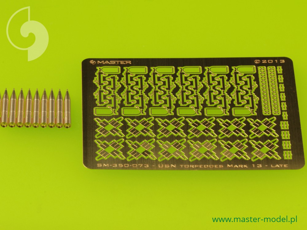 The set includes turned brass Mark 13 (22.4in) torpedoes and photoetched fret with trolleys parts.
