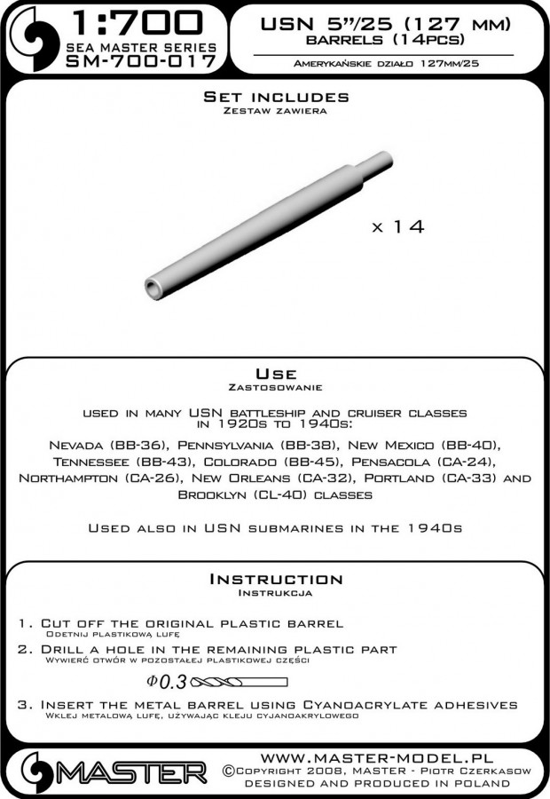 The set includes turned brass barrels. It is very simple to use in Your model, and makes it extremely realistic. Simply cut off the original plastic barrel and drill a hole in the remaining part and insert the metal barrel using Cyanoacrylate adhesives.