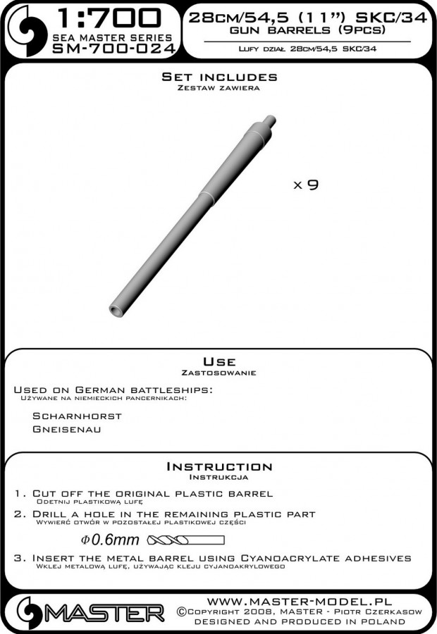 The set includes turned brass barrels. It is very simple to use in Your model, and makes it extremely realistic. Simply cut off the original plastic barrel and drill a hole in the remaining part and insert the metal barrel using Cyanoacrylate adhesives.