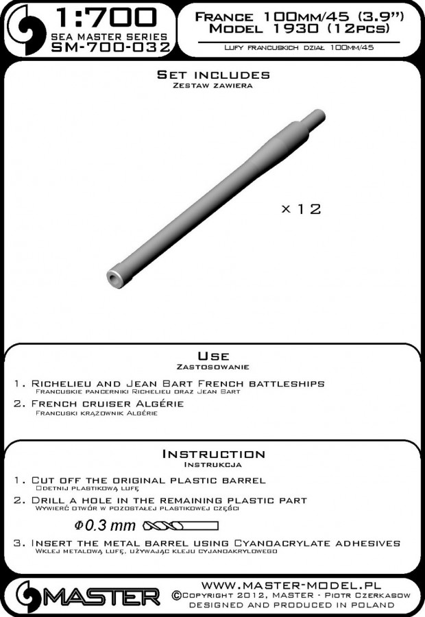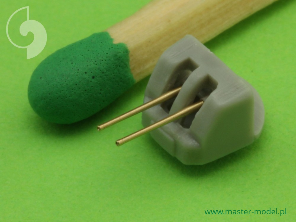 The set includes turned brass barrels. It is very simple to use in Your model, and makes it extremely realistic. Simply cut off the original plastic barrel and drill a hole in the remaining part and insert the metal barrel using Cyanoacrylate adhesives.