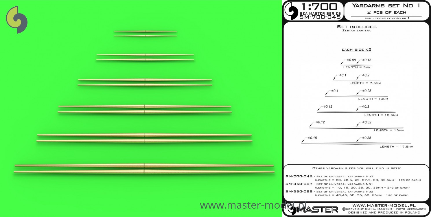 SM-700-046 - Set of universal yardarms No2 (lengths = 20, 22.5, 25, 27.5, 30, 32.5mm - 1pc of each).